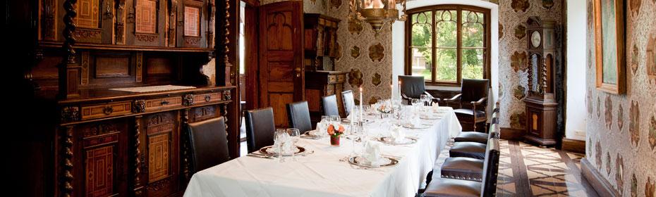 Der Tafelsaal bietet Platz für Gesellschaften bis 22 Personen, bei Bedarf kann eine zusätzliche Tafel für 12 Personen hinzugefügt werden.